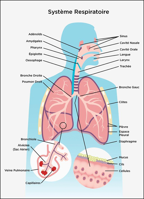 Le système respiratoire regroupe les organes qui permettent d’inspirer et d’expirer l’air dans le but de fournir de l’oxygène (O2) à l’organisme et d’éliminer le dioxyde de carbone (CO2). Lorsqu’un individu inspire l’air, celui-ci passe par la trachée, entre dans les bronches, passe par les bronchioles et se rend jusqu’aux alvéoles. C’est là que les échanges gazeux se font. Les alvéoles relient le système respiratoire aux capillaires du système circulatoire. Le sang qui circule dans les capillaires libère du CO2 et extrait l’O2 de l’air.