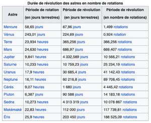 Exemples : Les tableaux ci-dessous (informations Wikipedia.org) donnent la durée d’une révolution autour du Soleil (d’une année) en nombre de rotations de l’astre (nombre de “jours” sur l’astre en question).